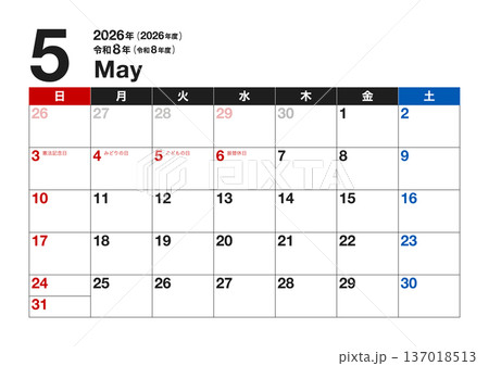 2026年5月カレンダー(令和8年・2026年度・令和8年度・A4横・A3横・日曜始まり)