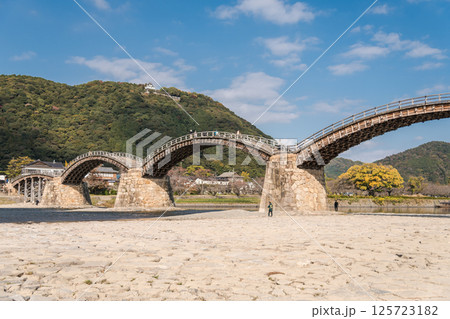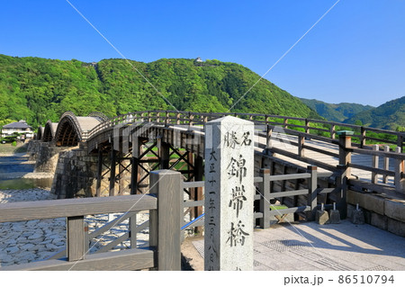 晴れた春の朝、青ぞら広がる錦帯橋 (山口県岩国市)