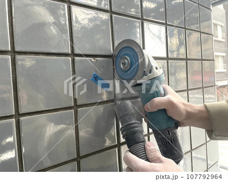粉塵機を使用したタイルカッター入れ