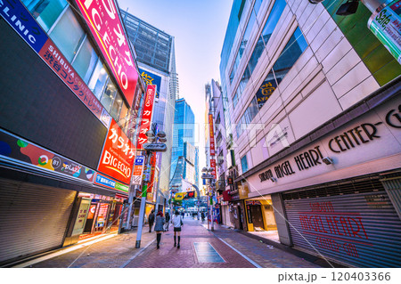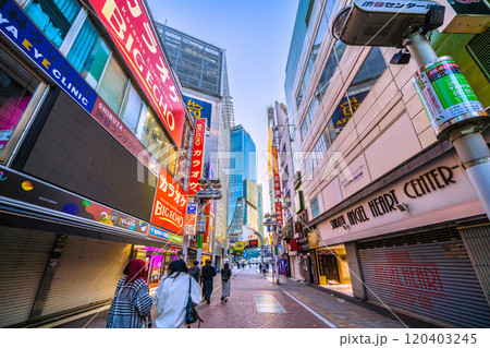 日本の東京都市景観 早朝の渋谷センター街から渋谷スクランブル交差点などを望む=9日、6時30分過ぎ