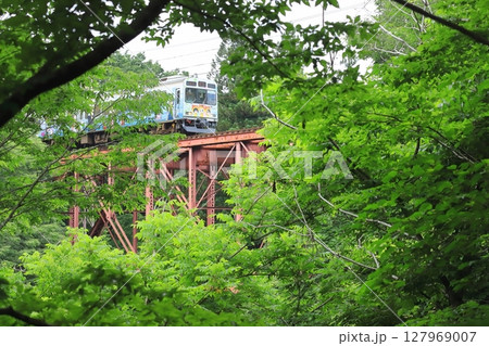 秩父鉄道「初夏の緑に包まれた山間部の鉄橋を走る電車」