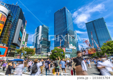 日本の東京都市景観 夏空に映える渋谷6棟、新時代へ…脱マスク完了…賑わう渋谷=8月25日