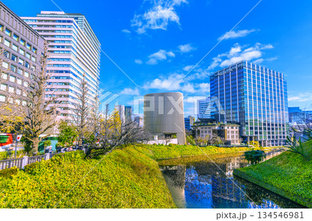 日本の東京都市景観 緑に映える大手町の交差点。外国人観光客らの姿も…4段に並ぶ道路標識・日比谷通り…
