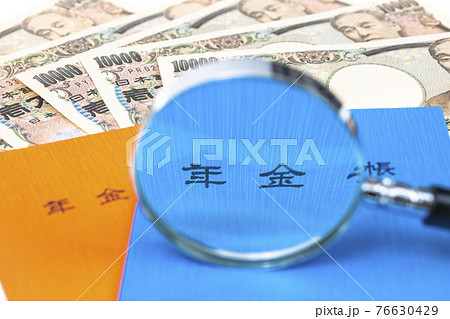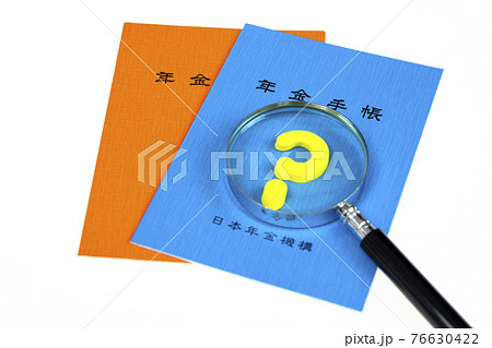 年金問題 年金手帳と拡大鏡とクエスチョンマーク