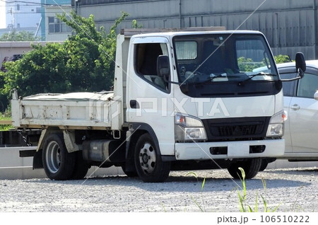 駐車場に並ぶトラック(トヨタ ダイナ 7代目 ダブルキャブ パワーゲート付)
