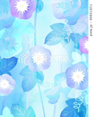 水彩の青い朝顔の涼しげな和風フレーム素材、テキストなし、ベクターイラストバナー、16:9 市松模様