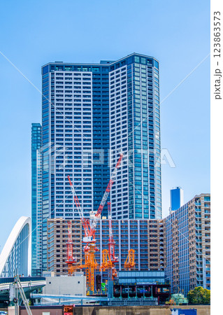 日本の東京都市景観 林立するクレーン…勝どきポンプ棟建設工事=19日