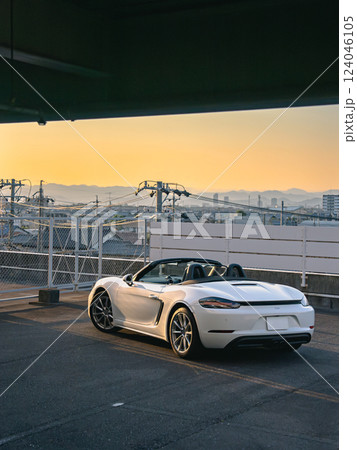 夕焼け空と白いオープンカー ポルシェ718ボクスター