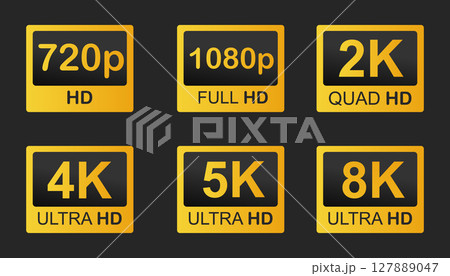 Video resolutions full ultra HD, video quality badge sticker icon. Video resolution set. 8k 4k 2k hd