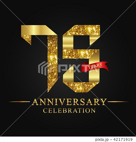 75 Anniversary gold numbers with golden confetti. Celebration 75th anniversary event party template