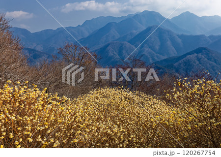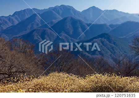 西丹沢・浅瀬権現山稜線のミツマタ群落と檜洞丸方面の山並み