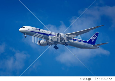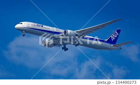 青空をバックに飛ぶ全日空(ANA)のボーイング787-10型旅客機
