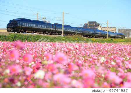 満開のコスモスと観光列車「36ぷらす3」(JR九州)