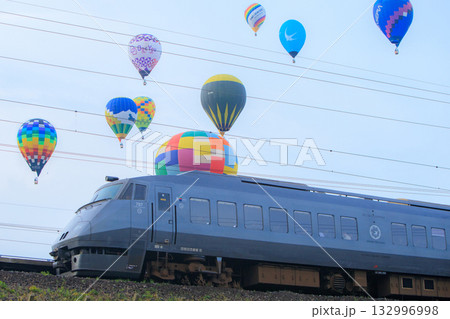 熱気球の下を駆け抜ける特急「リレーかもめ」(JR九州)