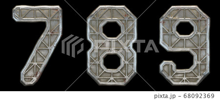 Set of numbers 7, 8, 9 made of industrial metal on black background 3d