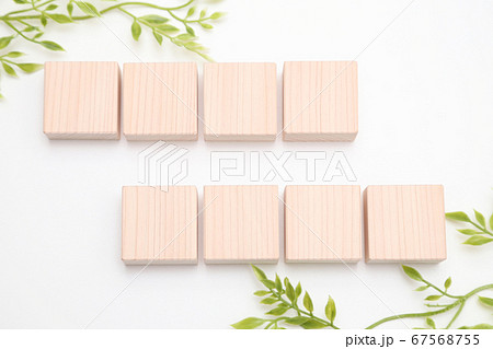 正方形四角形のヒノキのブロックと新緑イメージ コピースペース