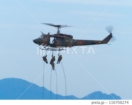 ヘリコプターからラペリング降下する兵士