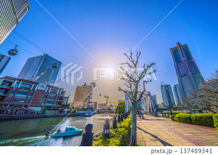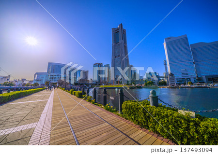 日本の横浜都市景観改修…ボードウォーク改修工事。汽車道に影が揺れる、水上タクシー…新時代へ希望の光