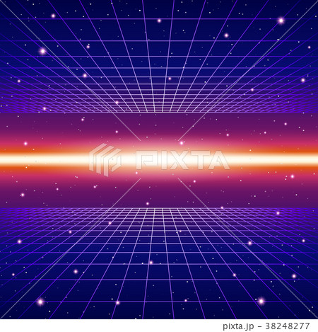 Retro neon background with 80s styled laser grid and stars