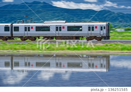 水田一面に水を張った夕映えの佐賀平野を行くJR長崎本線の普通列車