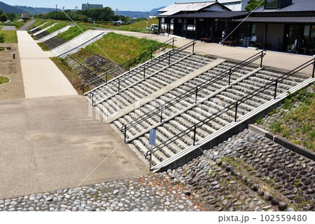 島田市 蓬莱橋南岸の散策路とショップと新緑