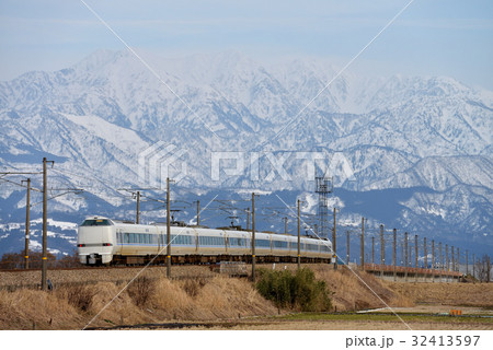 立山連峰をバックに走る681系2000番台特急はくたか9両