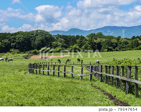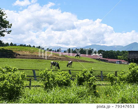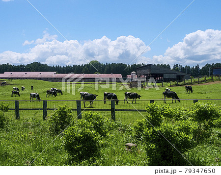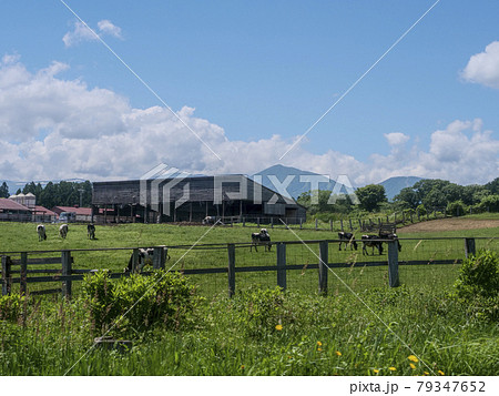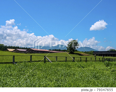 風景、写真 夏の小岩井農場の牛たちと湧き上がる雲 小岩井農場の牧場の風景 清々しい牧場の朝
