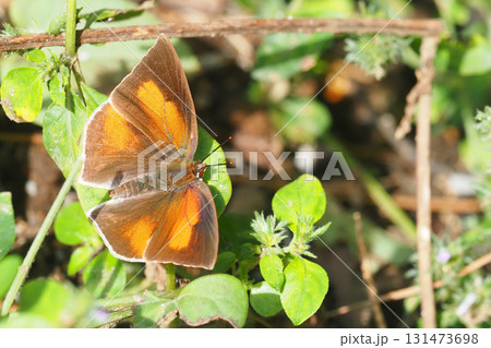 生き物 昆虫 ウラギンシジミ、オスの翅の表は茶色にオレンジの組み合わせです