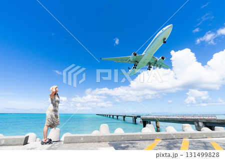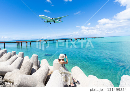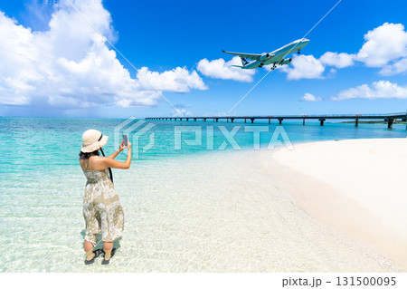宮古絶景 下地島空港前17エンドビーチの飛行機と若い女性