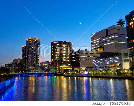 夕暮れの大阪 ほたるまちのビル群とライトアップされた堂島川