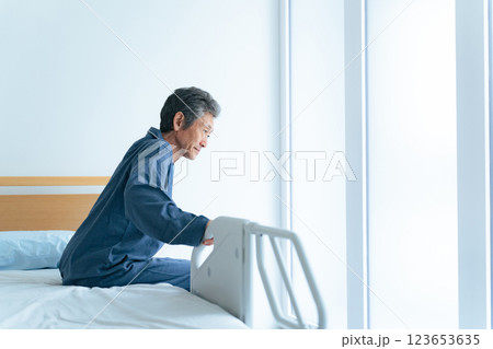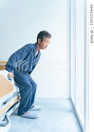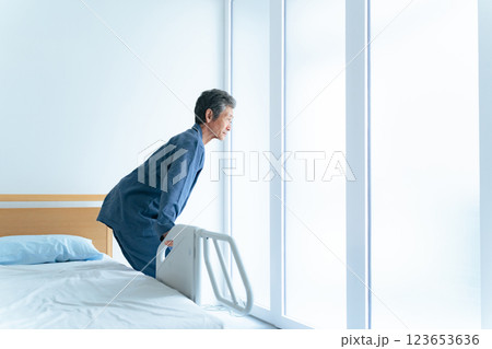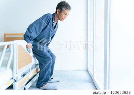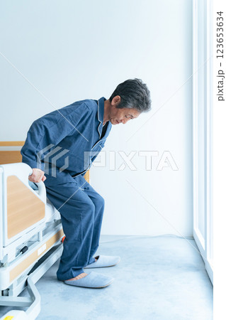 介護ベッドから立ち上がるシニア男性