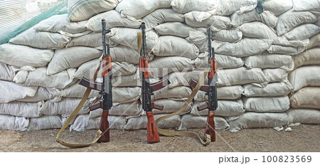 Three Kalashnikovs standing near sandbagged fortifications. AK-74 outdoor