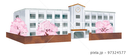 水彩風 桜と校舎