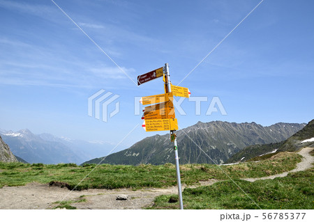 スイス版ハイキングコース標識。ポール下部にはツールドモンブランとアルプトレッキングの表示