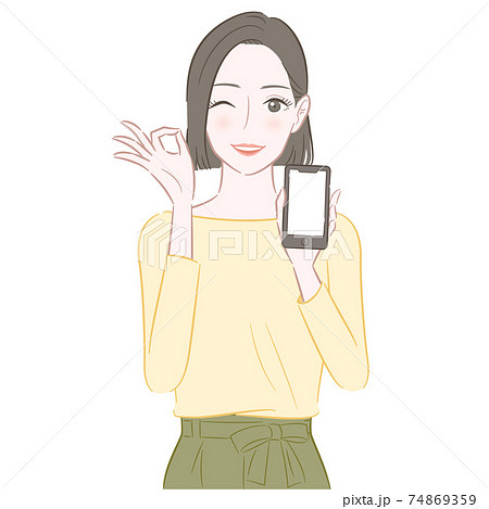 手に持つスマホを見せてウインクしながらOKポーズする女性のイラスト