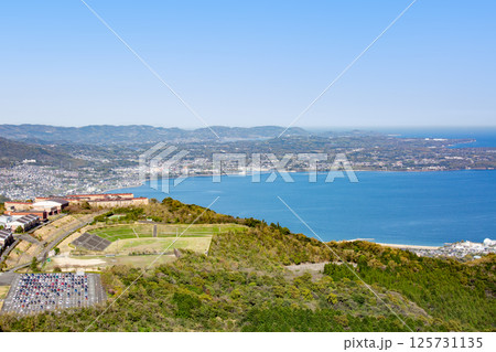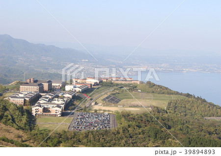 鶴見岳から見た東九州自動車道別府湾サービスエリアと立命館アジア太平洋大学