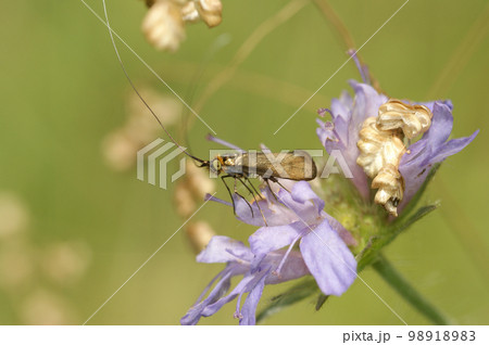 Close up on yellow metallic colored longhorn micro moth the Nemophora metallica on, a pink scabious flower