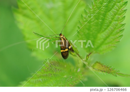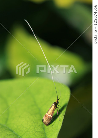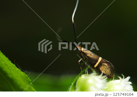 春の若葉に長い触角ときれいな黄金メタリック光沢のホソオビヒゲナガの美しい姿(マクロ撮影)