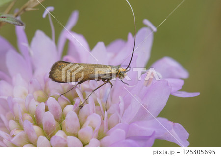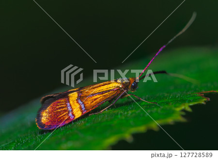 Closeup on a meadow long-horn moth, Cauchas rufimitrella , sitting on a green leaf