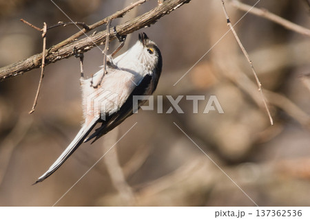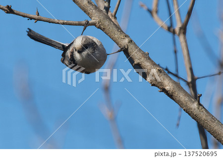 枝に止まり逆上がりをするシマエナガ