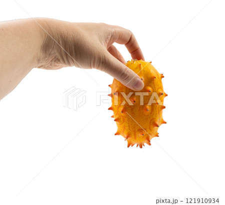Kiwano isolated, jelly melon, cucumis metuliferus ripe fruit, orange horned melon, african horned cucumber