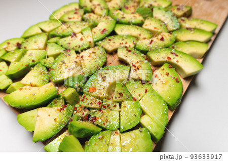 Avocado slices on a wooden textured background sprinkled with spices, bright accent. View from above
