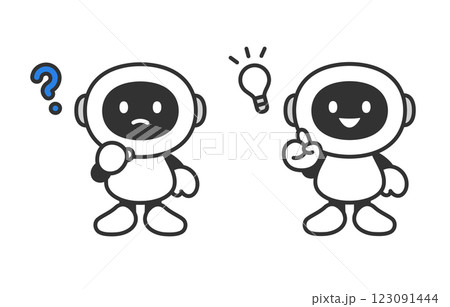 疑問・ひらめきのポーズをするAIロボットのセット【ベクターイラスト素材】