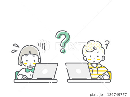 パソコンやIT、デジタルなイメージをあしらったシンプルポップなAIに関する困る人物付きイラスト