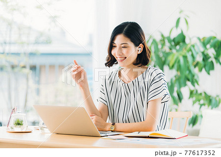 ノートパソコンで作業をする若い女性 リモートワーク・ビデオ通話 イメージ