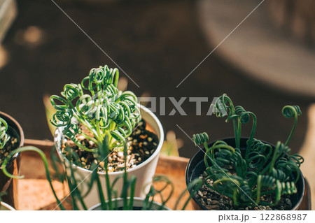 Curly green leaves of Albuca spiralis growing in a rocky desert garden, surrounded by succulents and dry soil.