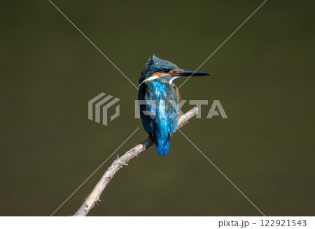 木に留まり、振り向いているオスのカワセミ 緑バック