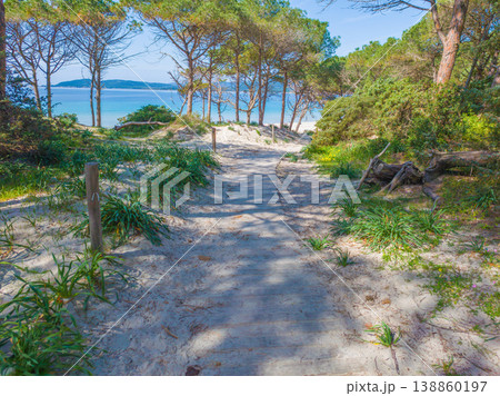 Aerial view of Maria Pia beach sandy shore seen from the water on a sunny morning