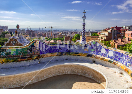 Impressive view of colorful Park Guell architectures designed by Antoni Gaudi, Barcelona, Spain