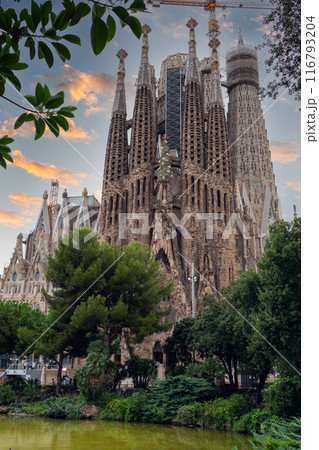 サグラダファミリアと水面に映える景観 春
